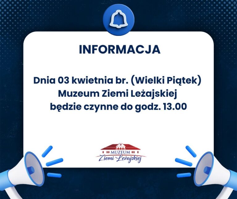 Szanowni Państwo, informujemy iż dnia 03 kwietnia br. (Wielki Piątek) Muzeum Ziemi Leżajskiej będzie czynne do godz. 13.00.