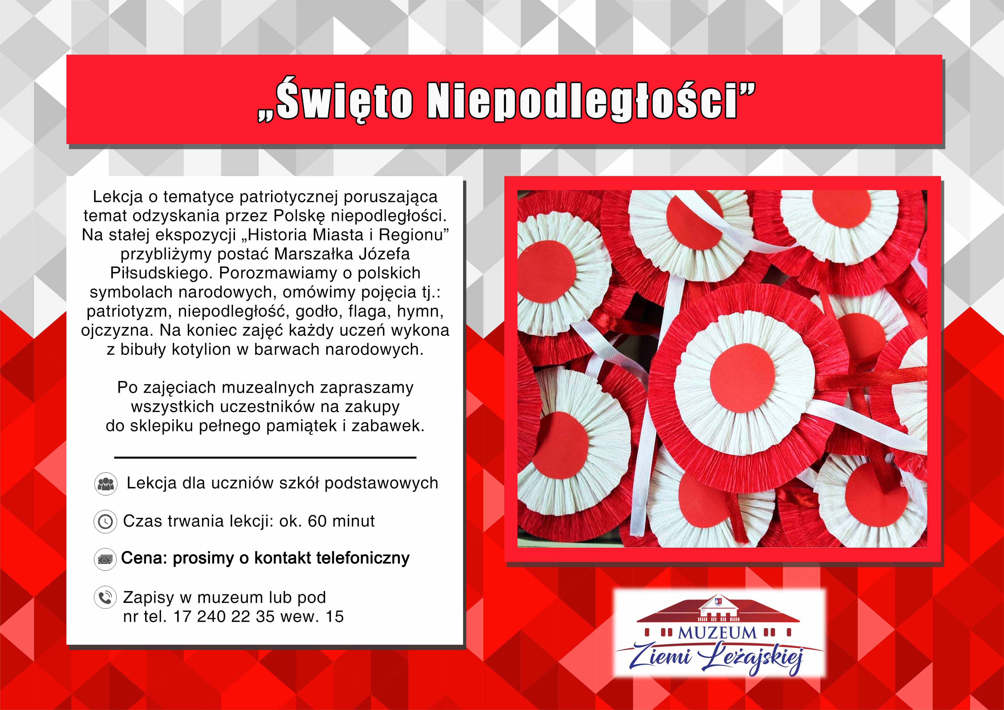 Opis lekcji: Lekcja o tematyce patriotycznej poruszająca temat odzyskania przez Polskę niepodległości. Na stałej ekspozycji „Historia Miasta i Regionu” przybliżymy postać Marszałka Józefa Piłsudskiego. Porozmawiamy o polskich symbolach narodowych, omówimy pojęcia tj.: patriotyzm, niepodległość, godło, flaga, hymn, ojczyzna. Na koniec zajęć każdy uczeń wykona z bibuły kotylion w barwach narodowych. Po zajęciach muzealnych zapraszamy wszystkich uczestników na zakupy do sklepiku pełnego pamiątek i zabawek.