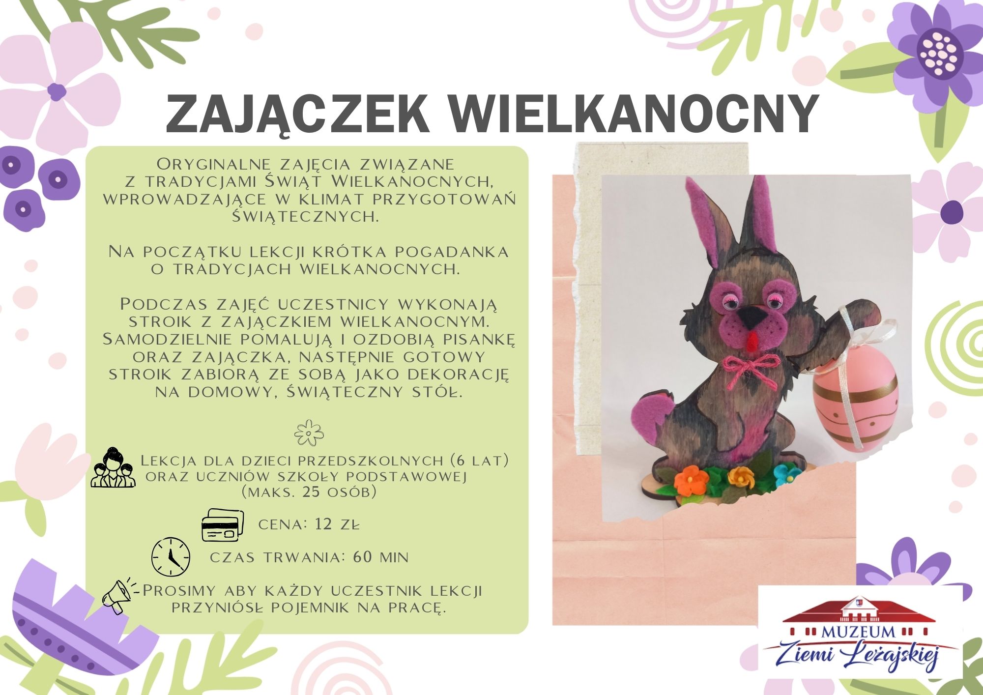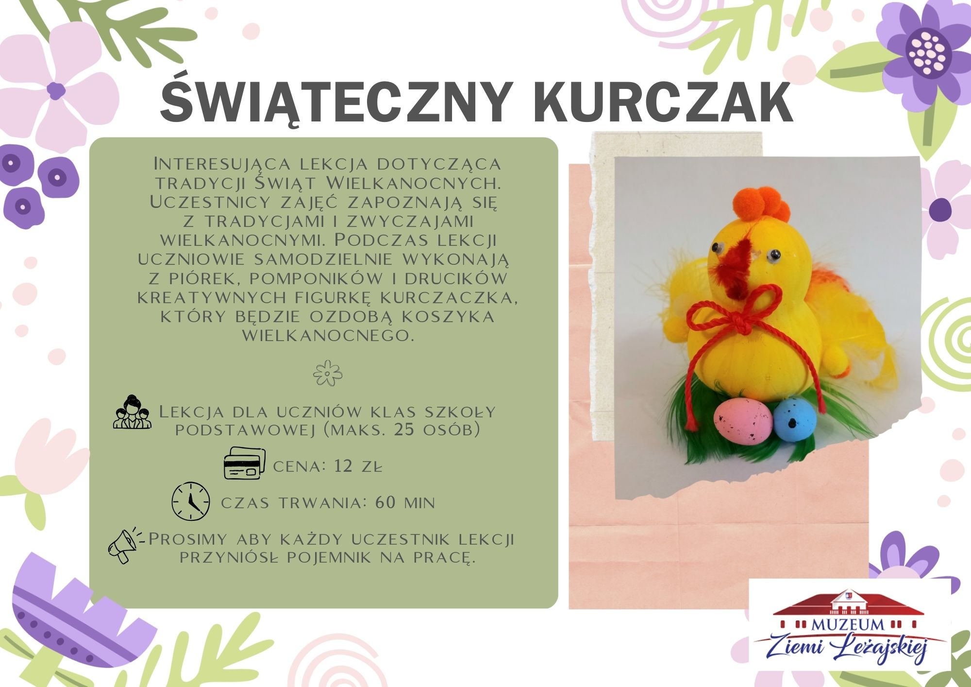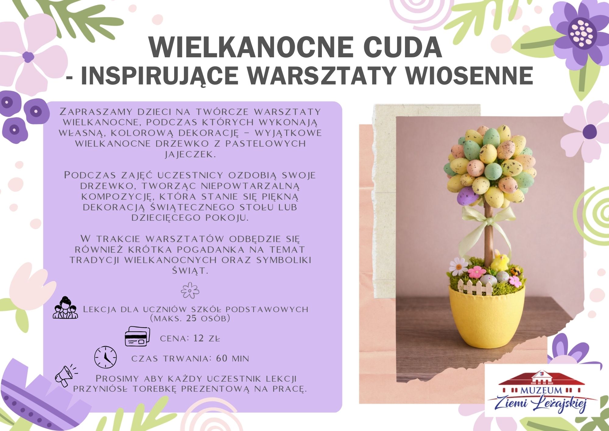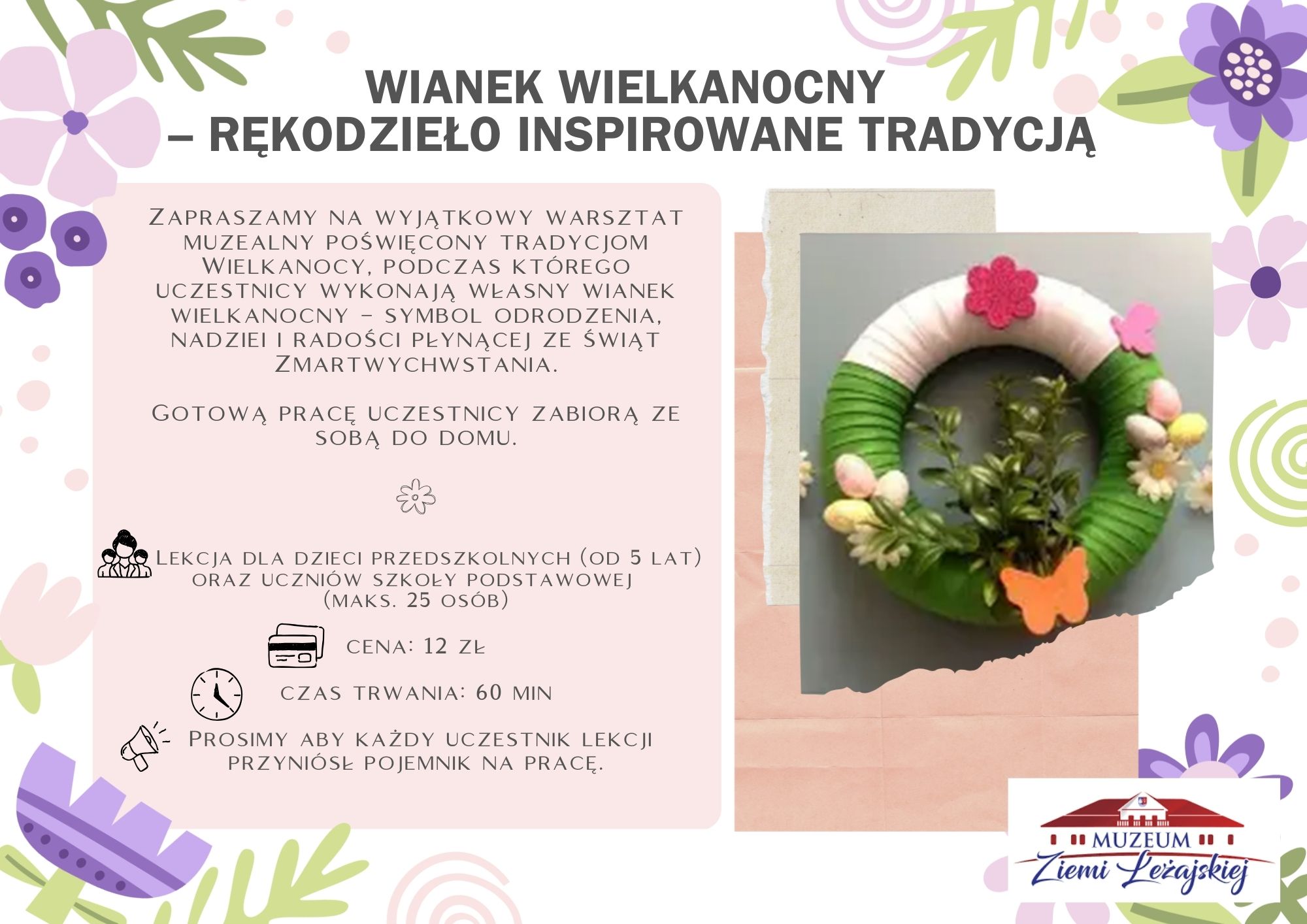 Zapraszamy na wyjątkowy warsztat muzealny poświęcony tradycjom Wielkanocy, podczas którego uczestnicy wykonają własny wianek wielkanocny – symbol odrodzenia, nadziei i radości płynącej ze Świąt Zmartwychwstania. Gotową pracę uczestnicy zabiorą ze sobą do domu. - Czas trwania lekcji: 60 min
