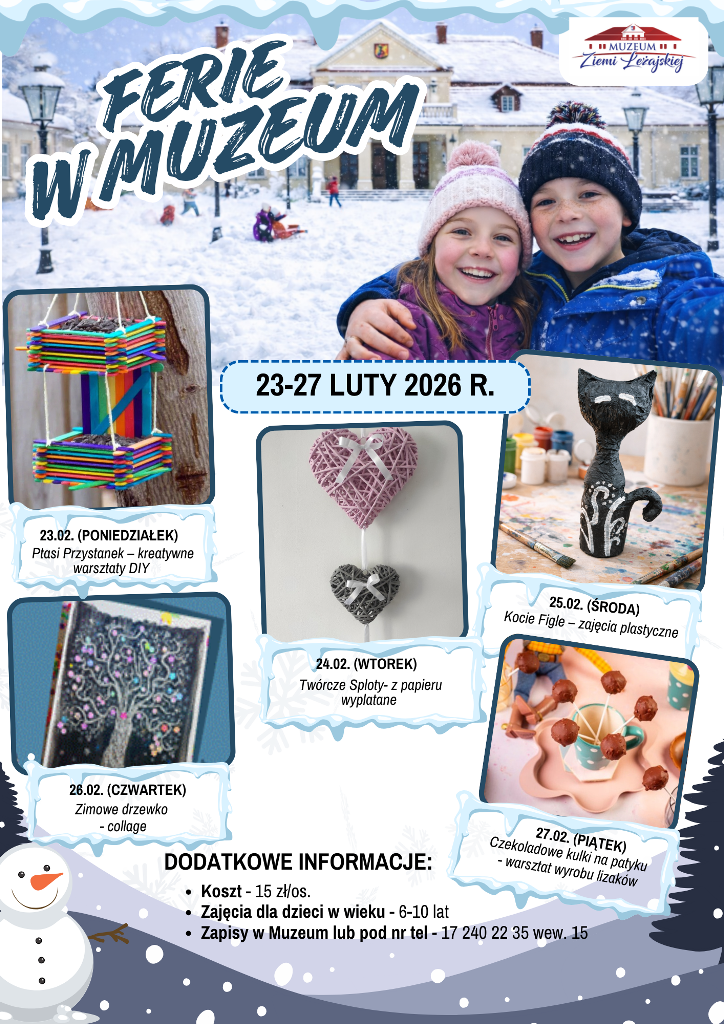 Zbliżające się ferie zimowe to doskonała okazja, by połączyć dobrą zabawę z nauką i rozwijaniem dziecięcej kreatywności. Muzeum zaprasza dzieci z terenu powiatu leżajskiego na cykl wyjątkowych warsztatów i zajęć edukacyjnych, które odbędą się w przyjaznej, twórczej atmosferze.