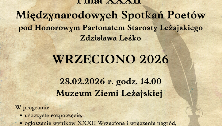 Muzeum Ziemi Leżajskiej wraz ze Stowarzyszeniem Folklorystycznym „Majdaniarze” oraz Stowarzyszeniem Literackim „Witryna” zapraszają do Muzeum Ziemi Leżajskiej na finał XXXII edycji Międzynarodowych Spotkań Poetów „Wrzeciono 2026”.