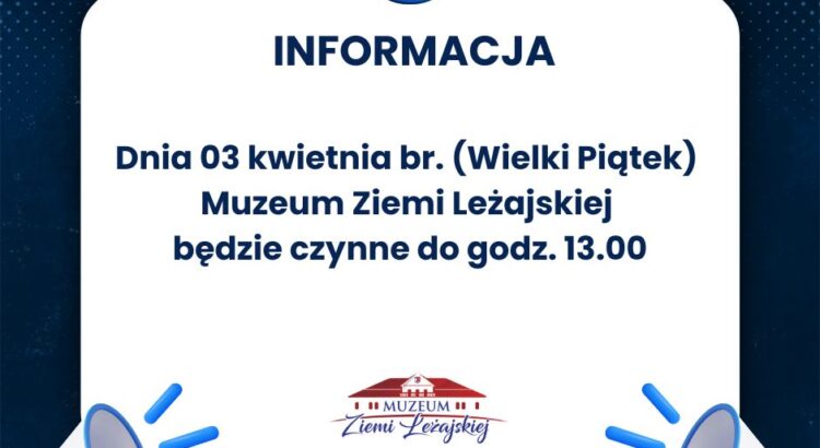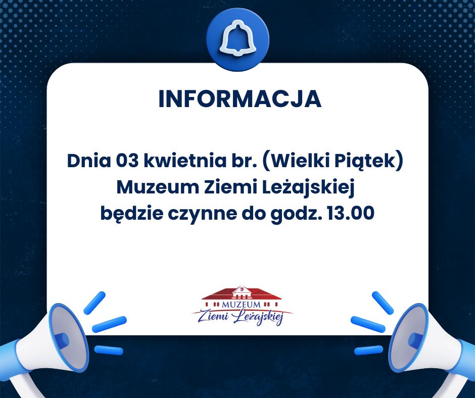 Informacja dot. godzin otwarcia Muzeum w Wielki Piątek 1 kwietnia 2026 Jacek Kwieciński Szanowni Państwo, informujemy iż dnia 03 kwietnia br. (Wielki Piątek) Muzeum Ziemi Leżajskiej będzie czynne do godz. 13.00.