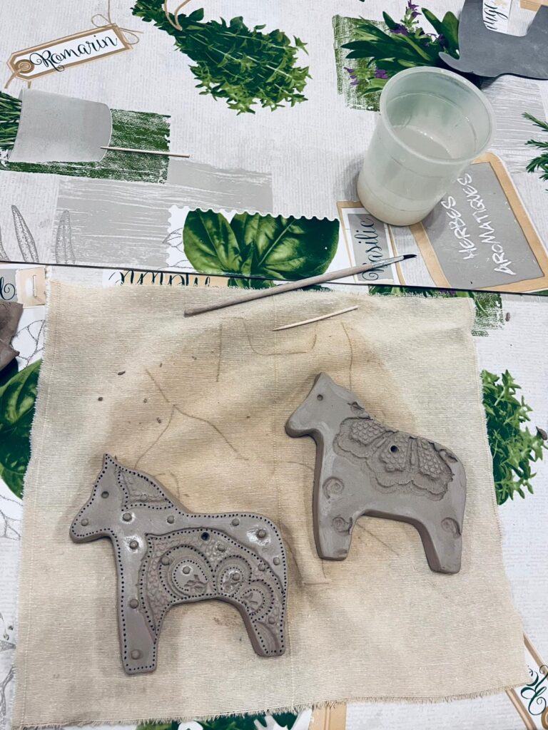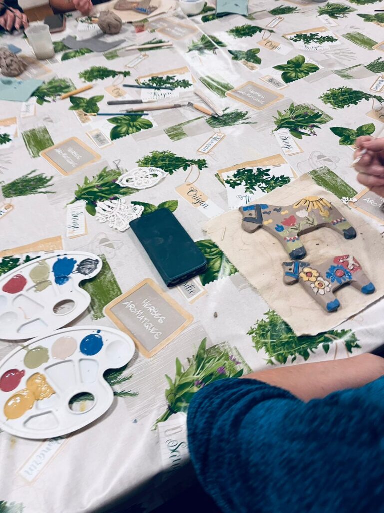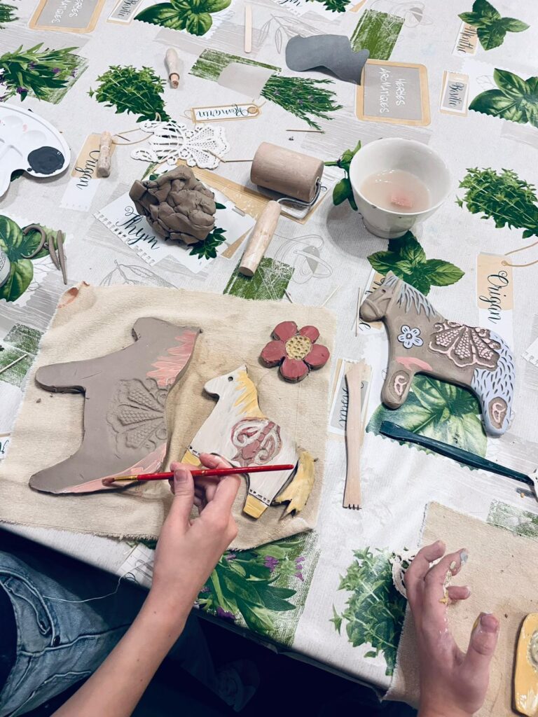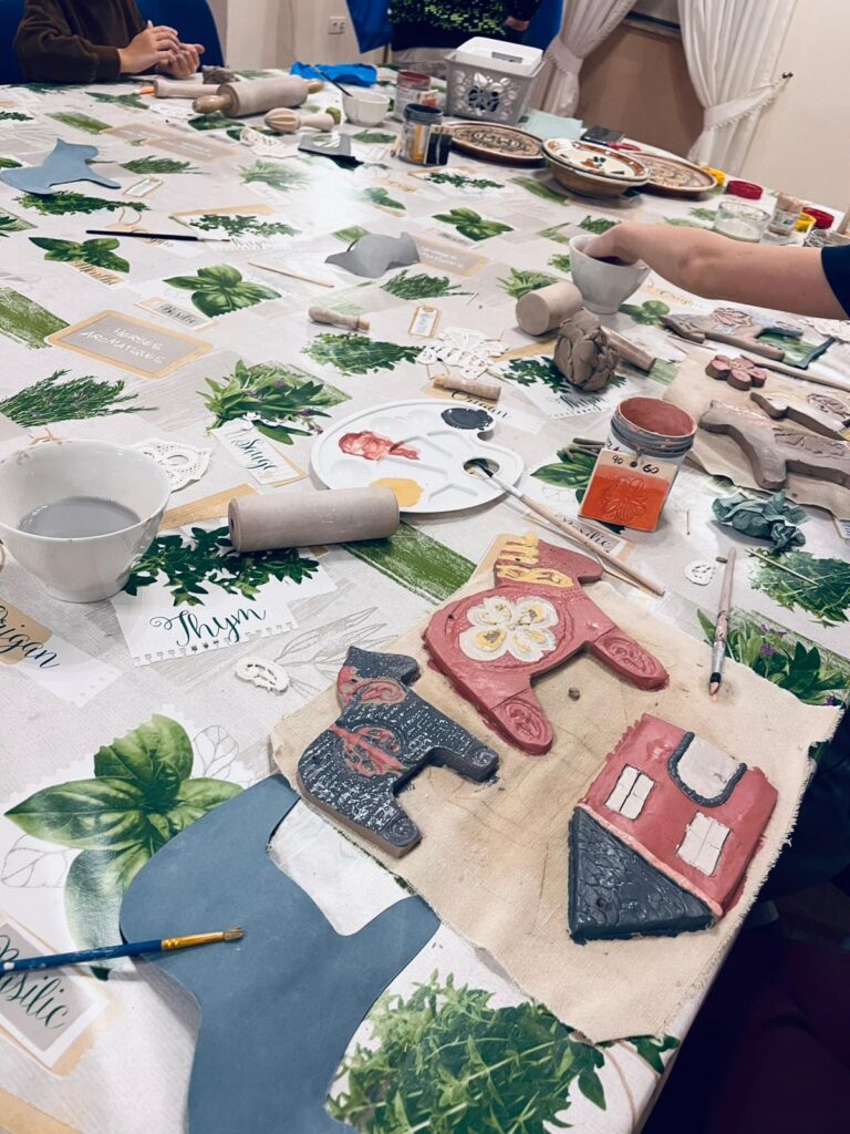 W części praktycznej motywem przewodnim był konik z gliny, zdobiony ludowymi wzorami – uczestnicy z zapałem formowali sylwetki koników, dodając im grzywy, ogony i fantazyjne ornamenty nawiązujące do tradycyjnych zdobień. Obok nich powstawały także inne formy – domki, choinki, kwiatuszki i różne drobne ozdoby, które po wypale staną się trwałą pamiątką z warsztatów. Atmosfera spotkania była niezwykle ciepła i twórcza – uczestnicy chętnie dzielili się pomysłami, a praca z naturalnym materiałem stała się pretekstem do rozmów o tradycjach, dawnej wsi i znaczeniu rękodzieła w codziennym życiu.