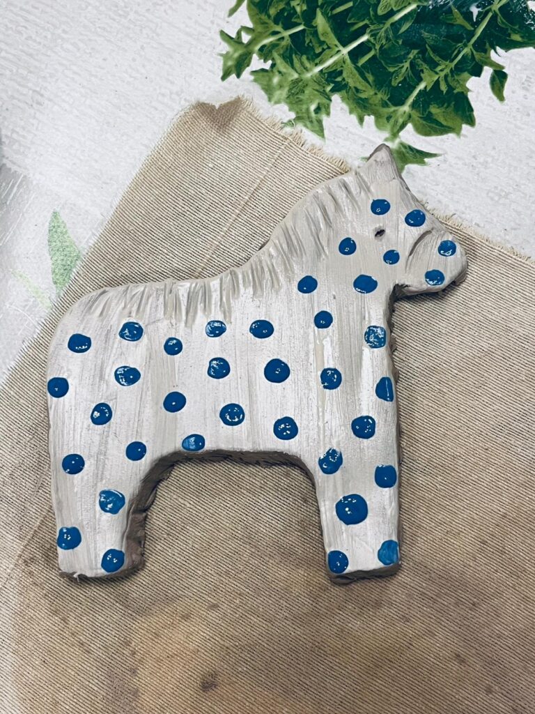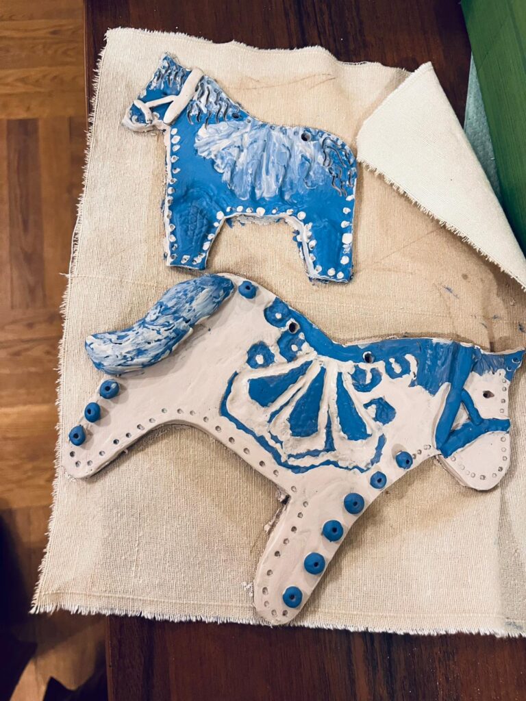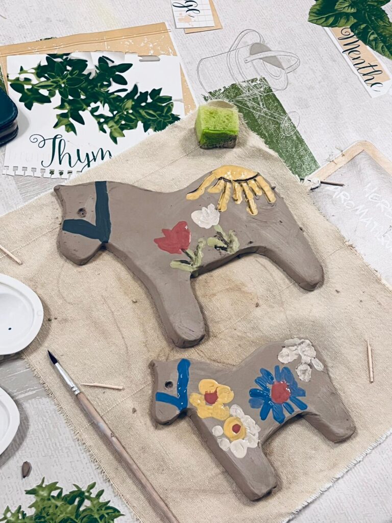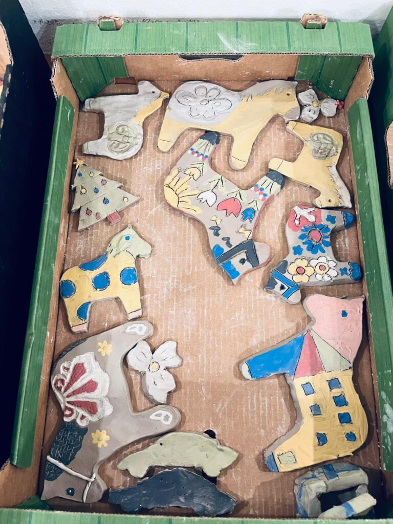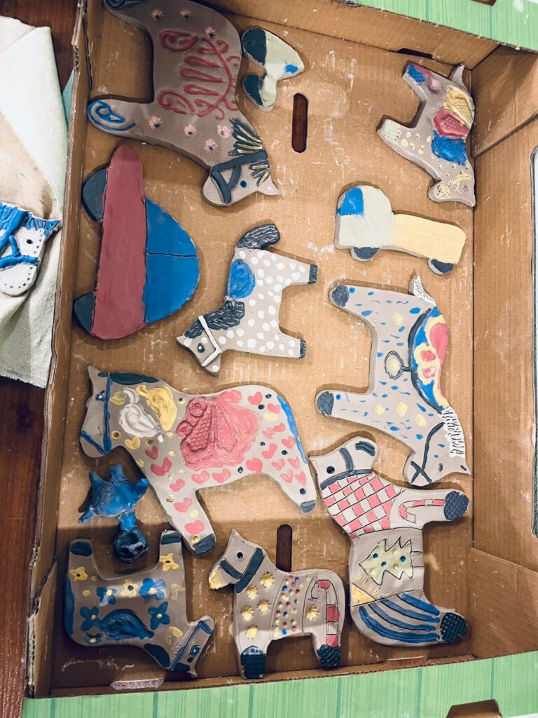 W części praktycznej motywem przewodnim był konik z gliny, zdobiony ludowymi wzorami – uczestnicy z zapałem formowali sylwetki koników, dodając im grzywy, ogony i fantazyjne ornamenty nawiązujące do tradycyjnych zdobień. Obok nich powstawały także inne formy – domki, choinki, kwiatuszki i różne drobne ozdoby, które po wypale staną się trwałą pamiątką z warsztatów. Atmosfera spotkania była niezwykle ciepła i twórcza – uczestnicy chętnie dzielili się pomysłami, a praca z naturalnym materiałem stała się pretekstem do rozmów o tradycjach, dawnej wsi i znaczeniu rękodzieła w codziennym życiu.