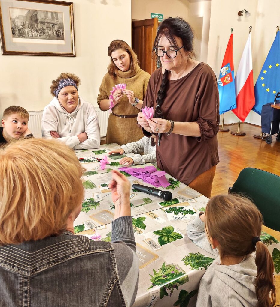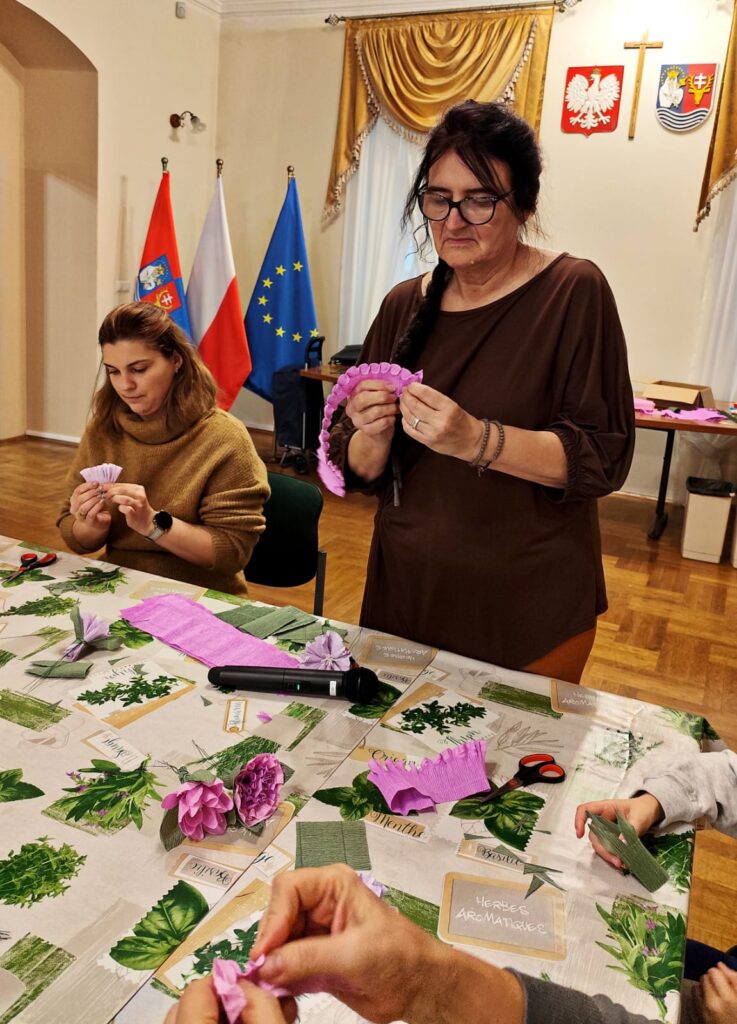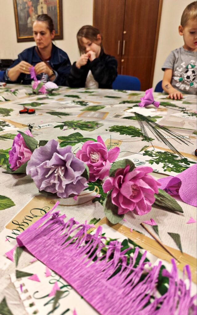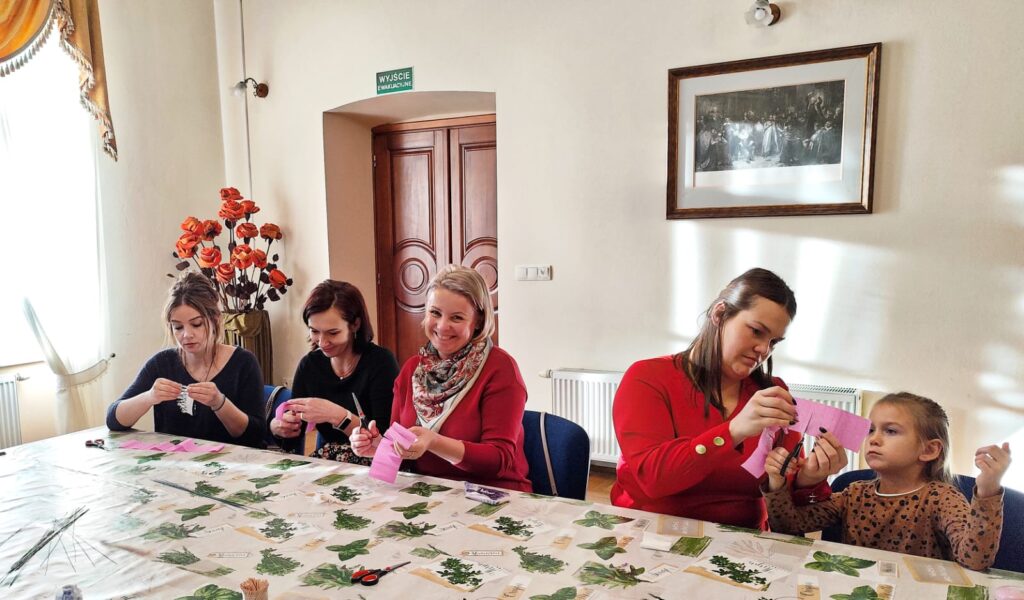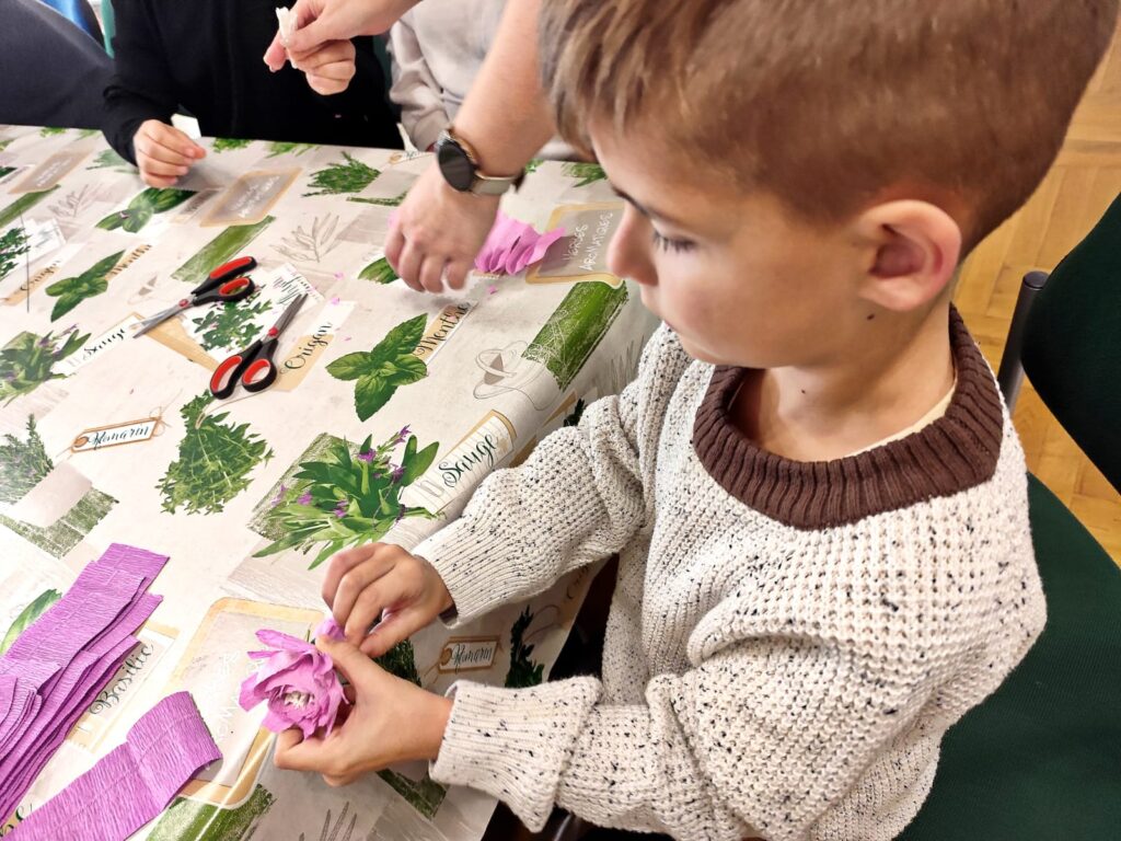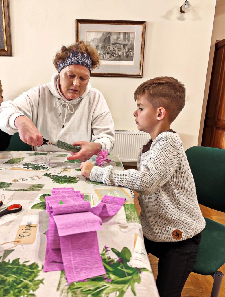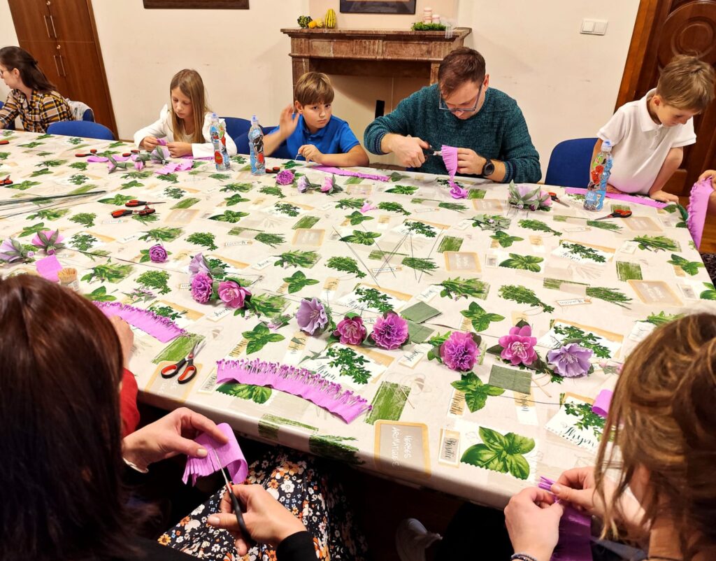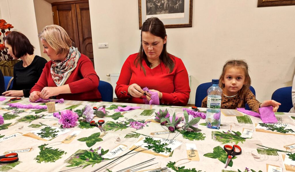 Uczestnicy – zarówno dzieci, jak i dorośli – z zaangażowaniem wycinali płatki, formowali kwiatowe główki i zanurzali je w ciepłym wosku, obserwując, jak miękka bibuła zyskuje nowy kształt i trwałość. Każda praca była inna, a w powietrzu unosiła się atmosfera skupienia, kreatywności i wzajemnej pomocy. Warsztaty stały się nie tylko okazją do rozwijania zdolności manualnych, ale też momentem refleksji nad znaczeniem dawnych zwyczajów i pięknem prostych, naturalnych form wyrazu.