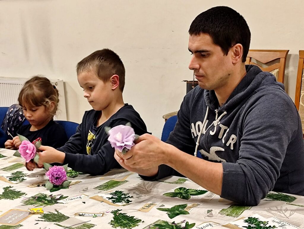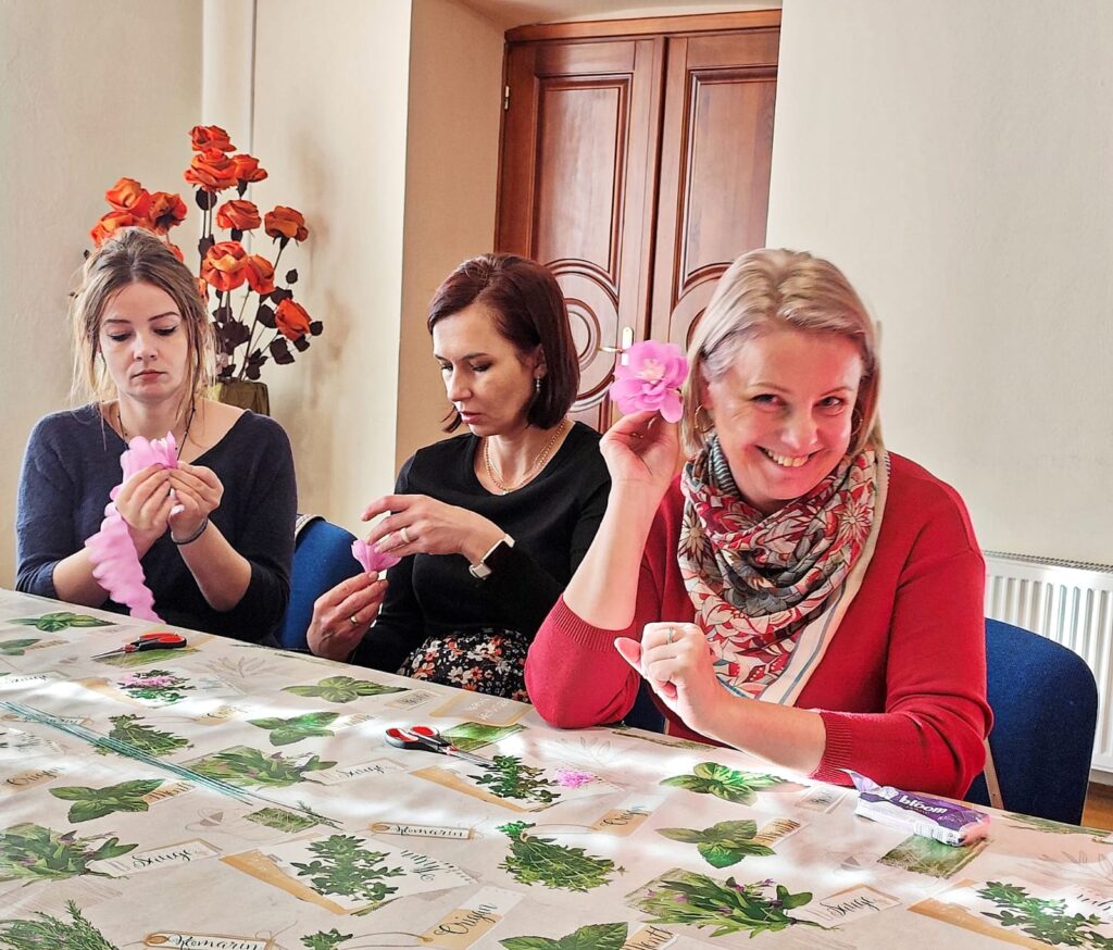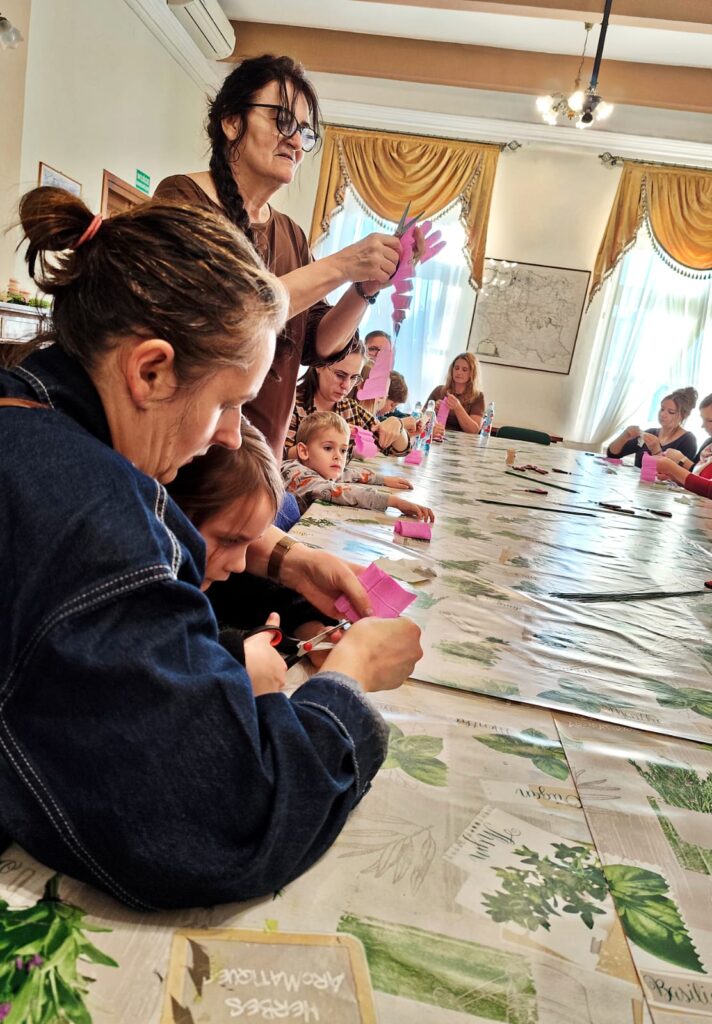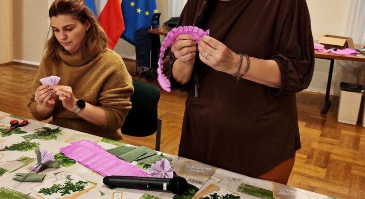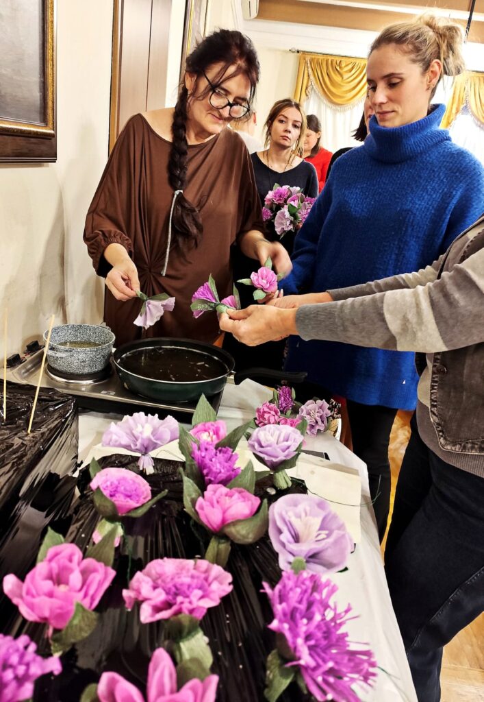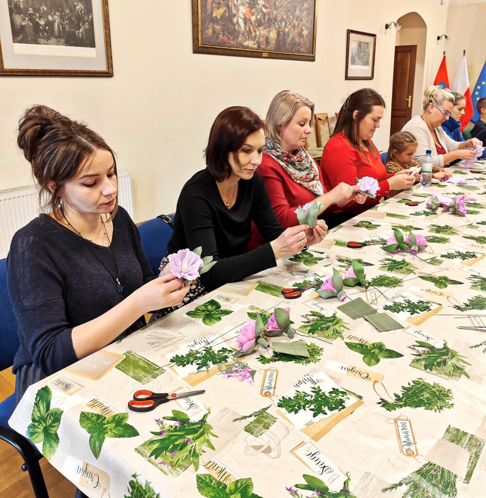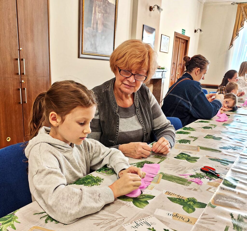 Uczestnicy – zarówno dzieci, jak i dorośli – z zaangażowaniem wycinali płatki, formowali kwiatowe główki i zanurzali je w ciepłym wosku, obserwując, jak miękka bibuła zyskuje nowy kształt i trwałość. Każda praca była inna, a w powietrzu unosiła się atmosfera skupienia, kreatywności i wzajemnej pomocy. Warsztaty stały się nie tylko okazją do rozwijania zdolności manualnych, ale też momentem refleksji nad znaczeniem dawnych zwyczajów i pięknem prostych, naturalnych form wyrazu.