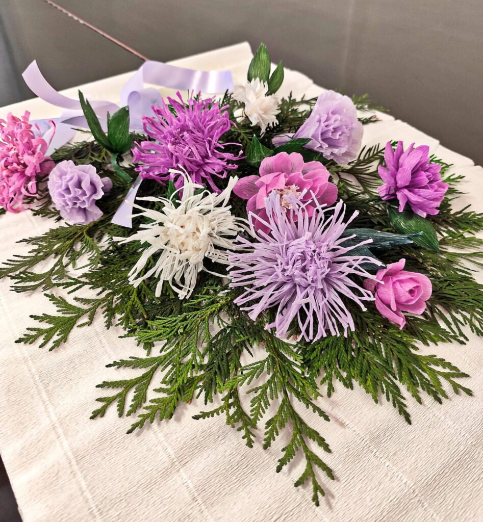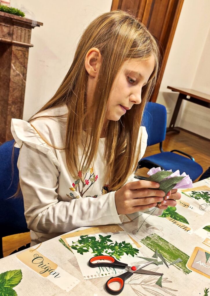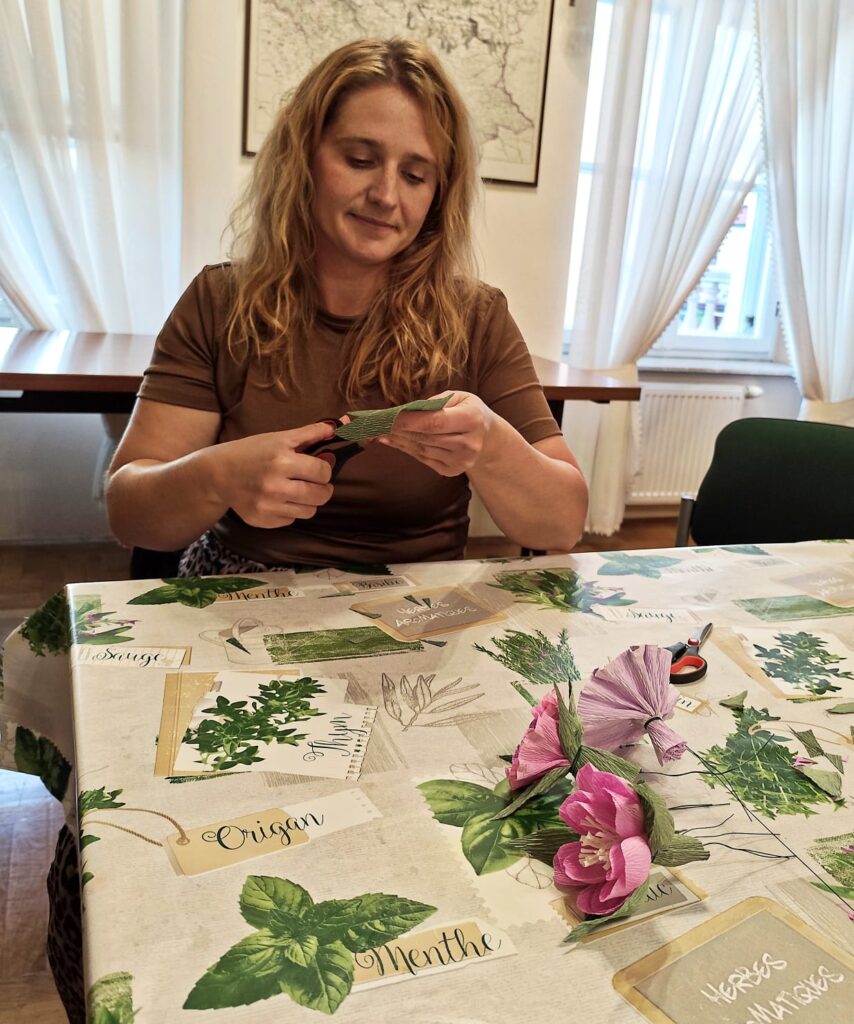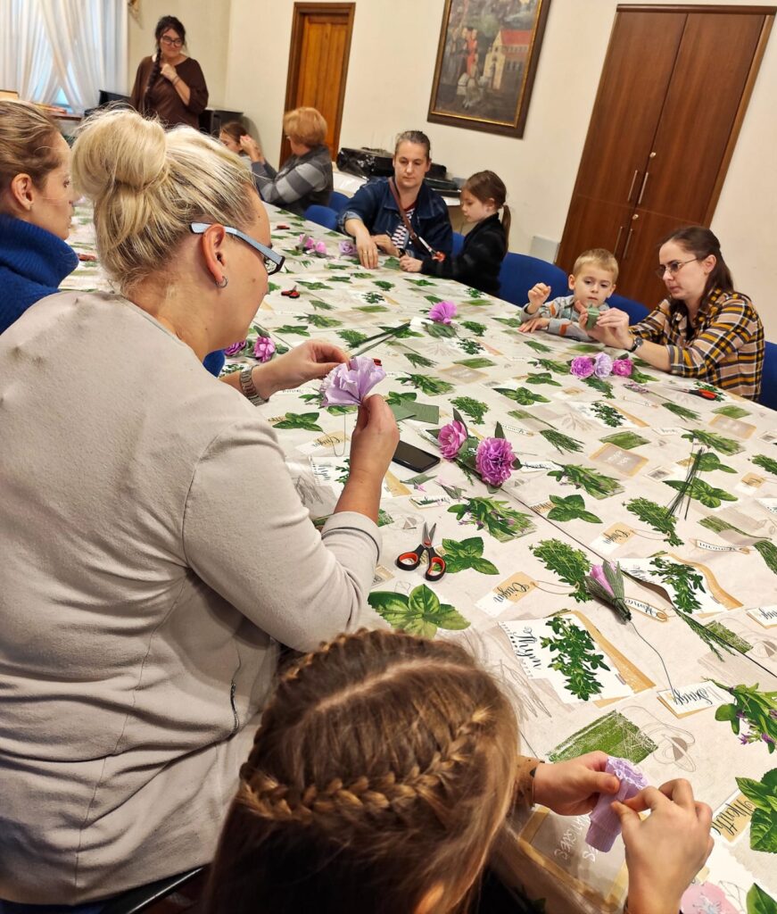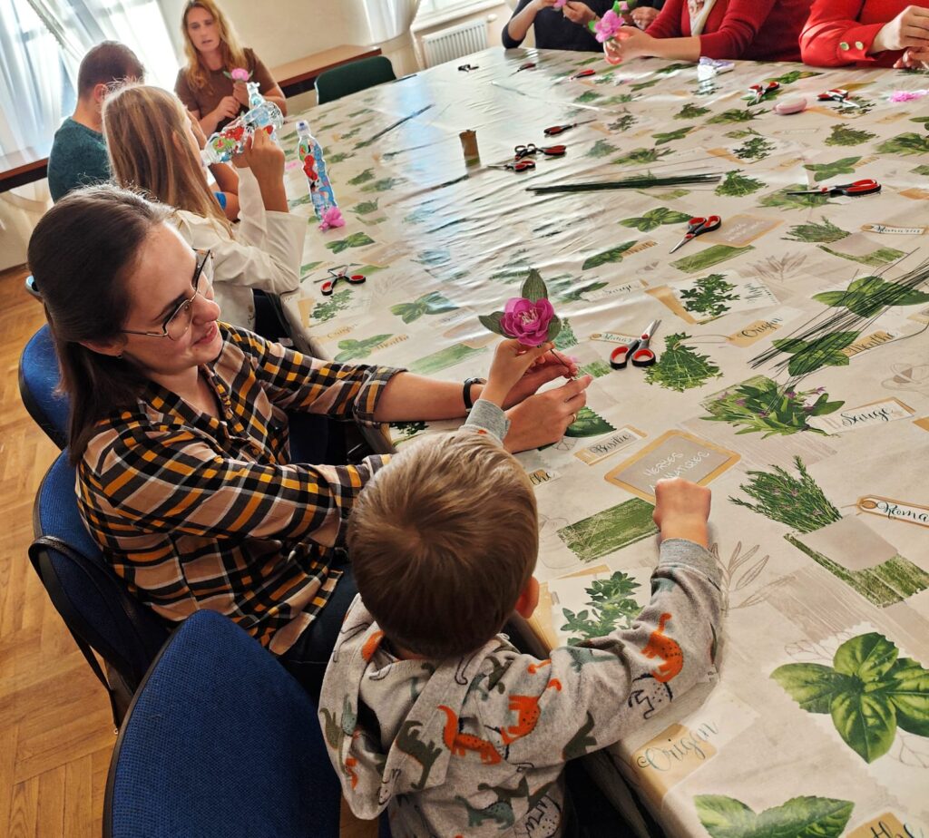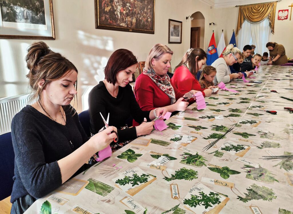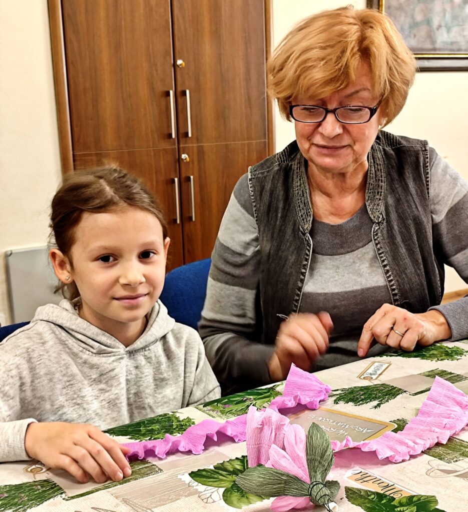 Uczestnicy – zarówno dzieci, jak i dorośli – z zaangażowaniem wycinali płatki, formowali kwiatowe główki i zanurzali je w ciepłym wosku, obserwując, jak miękka bibuła zyskuje nowy kształt i trwałość. Każda praca była inna, a w powietrzu unosiła się atmosfera skupienia, kreatywności i wzajemnej pomocy. Warsztaty stały się nie tylko okazją do rozwijania zdolności manualnych, ale też momentem refleksji nad znaczeniem dawnych zwyczajów i pięknem prostych, naturalnych form wyrazu.