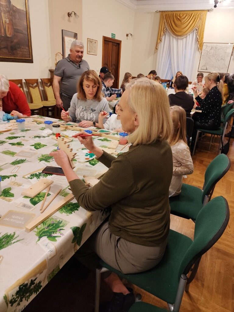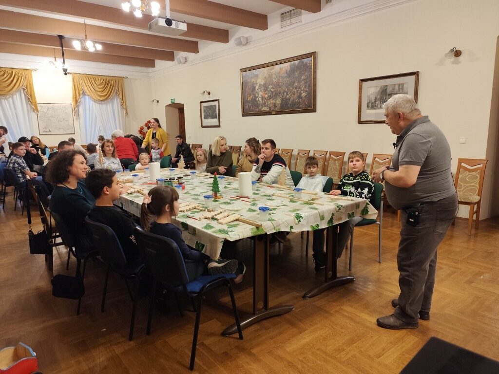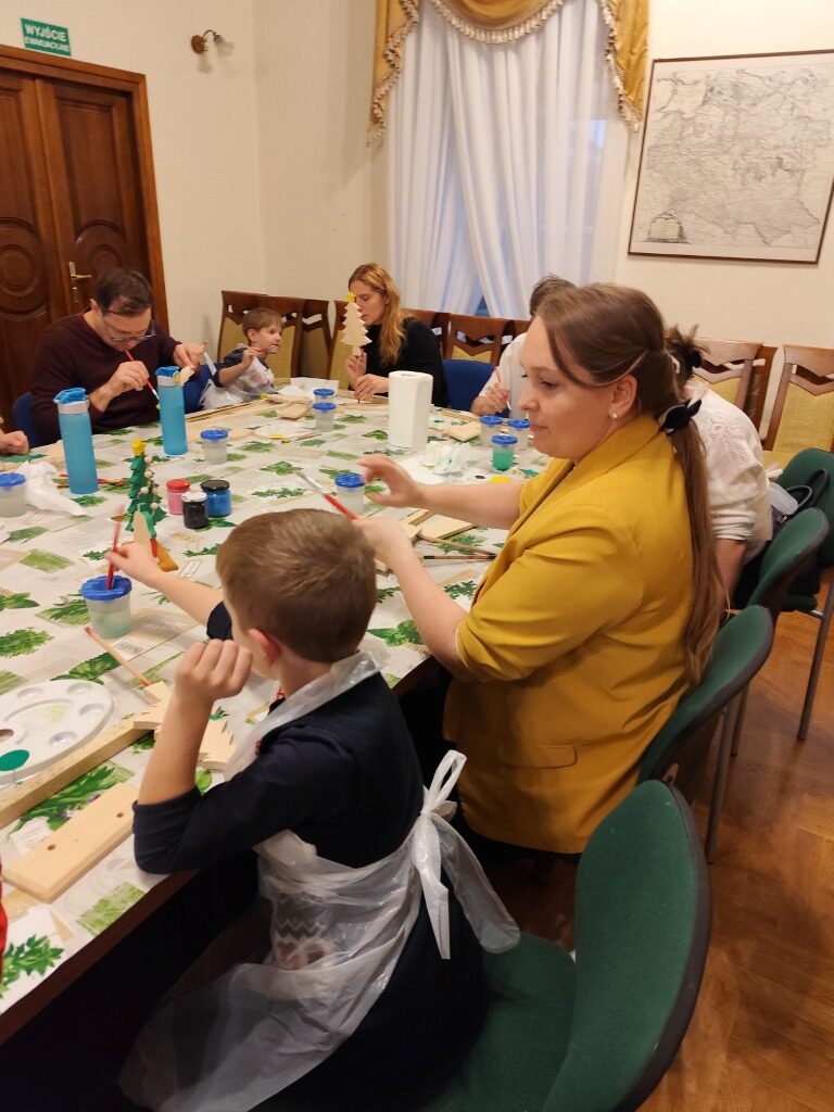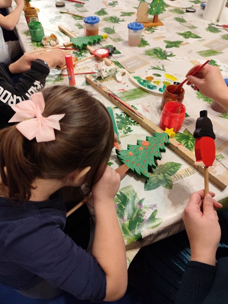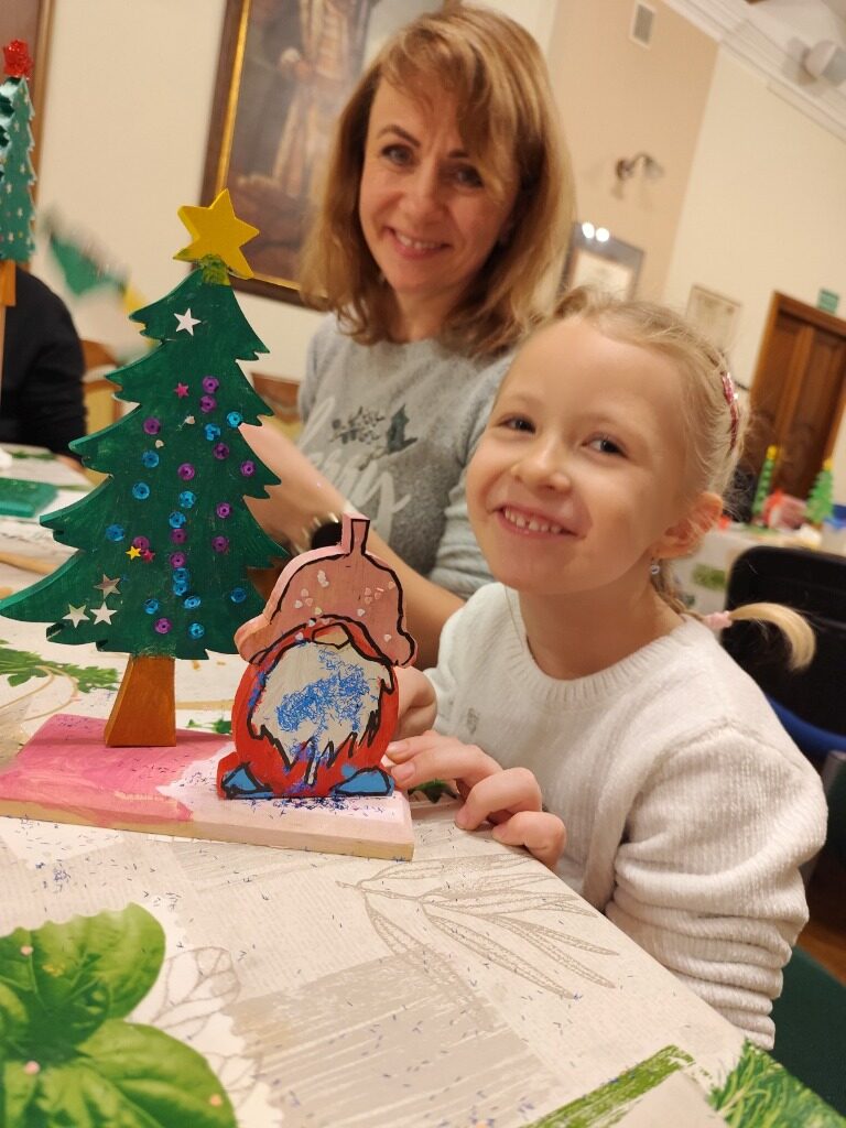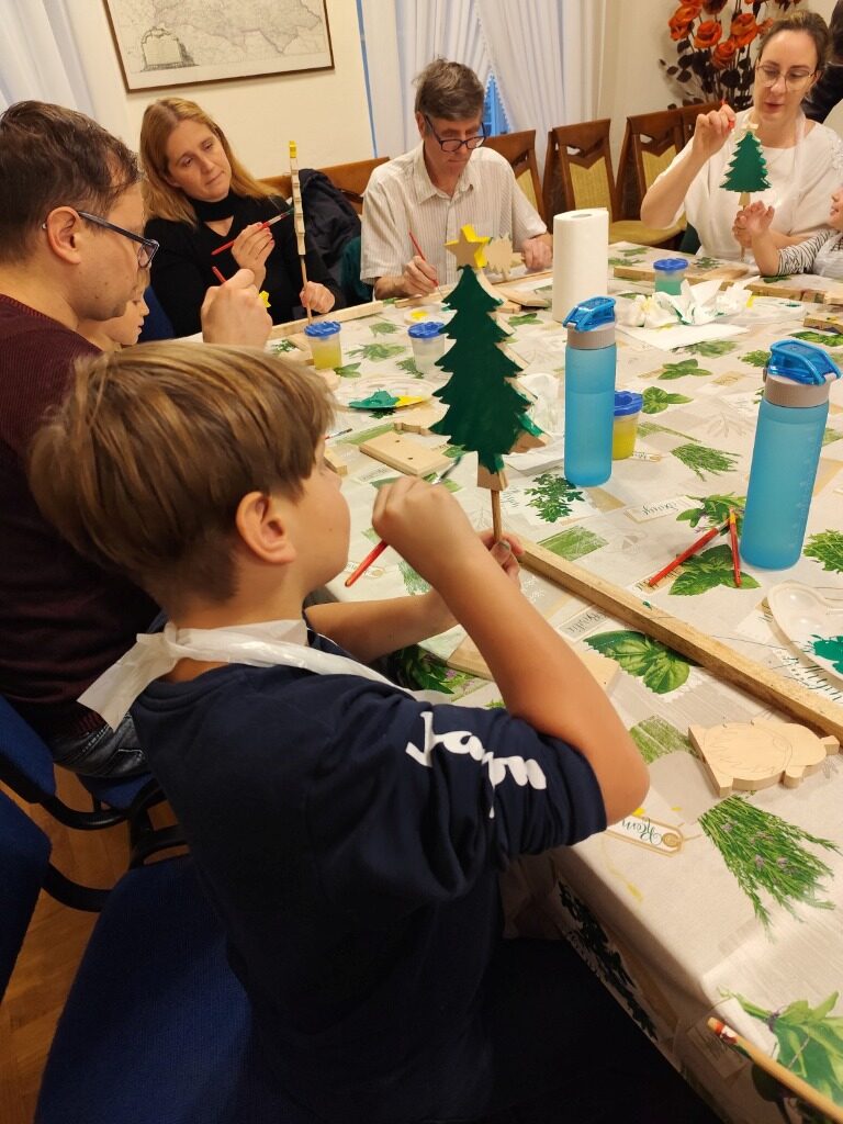 Najbardziej wyczekiwanym momentem była część praktyczna. Ze względu na zbliżający się mikołajkowy czas, każdy uczestnik wykonał drewnianą ozdobę w formie stroika z choinką i skrzatem. Malowanie, zdobienie, wybór kolorów i detali – wszystko zależało od wyobraźni twórców.
