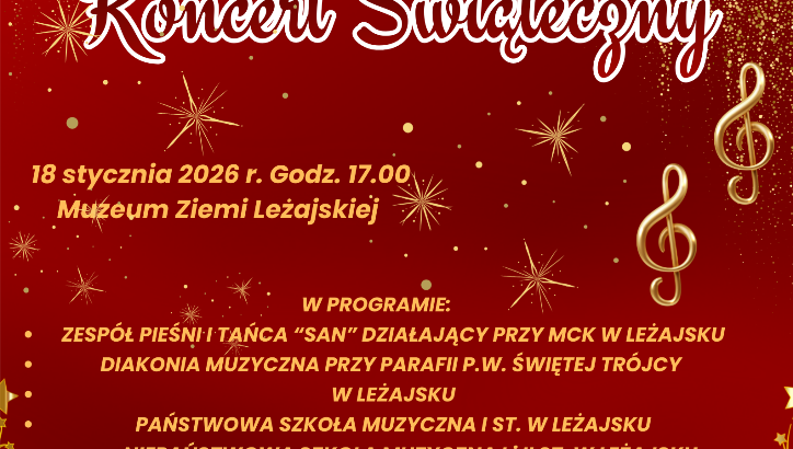Serdecznie zapraszamy na koncert świąteczny, który odbędzie się 18 stycznia br. (niedziela) o godz. 17:00 w sali konferencyjnej Muzeum Ziemi Leżajskiej.