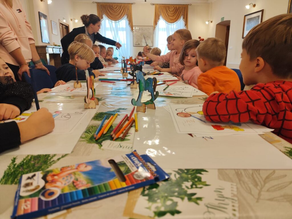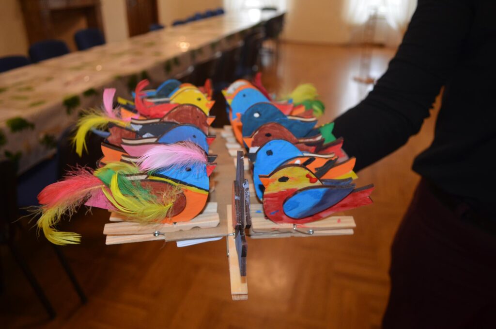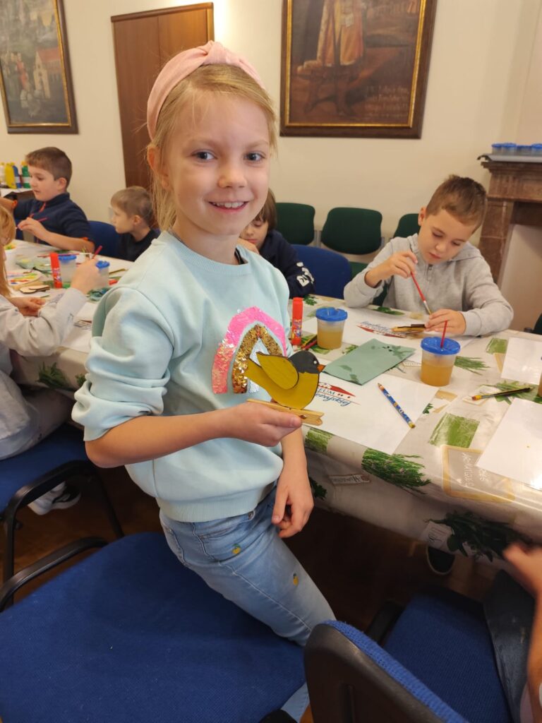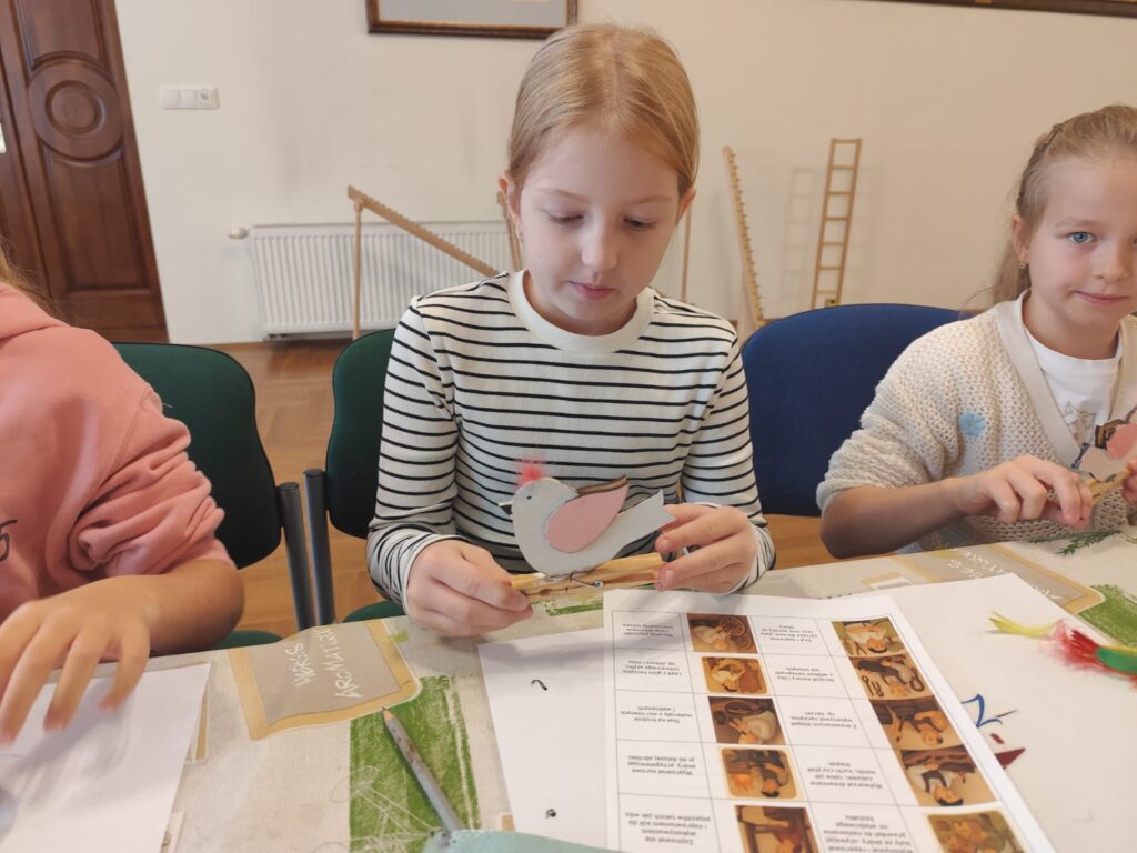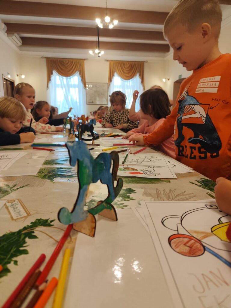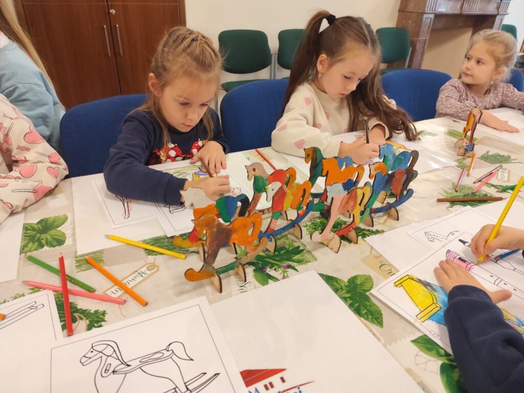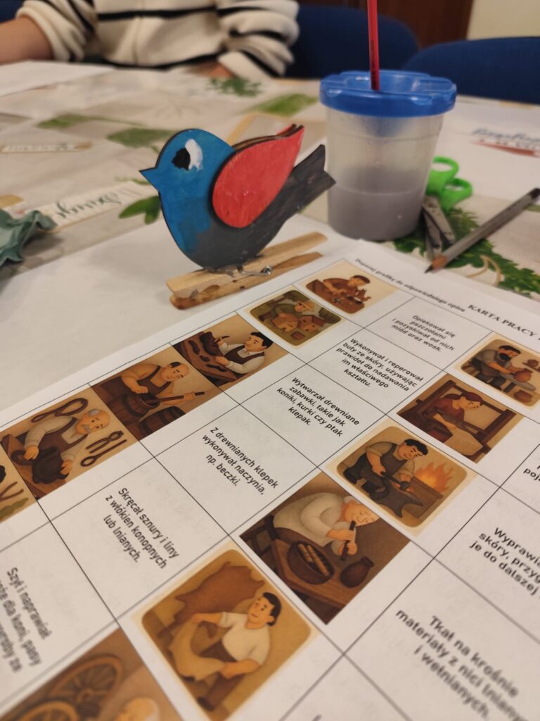 Szczególne miejsce w zajęciach zajmuje postać zabawkarza, którego praca była ściśle związana z naszym regionem. Dzieci mają okazję obejrzeć i przetestować dawne drewniane, ruchome zabawki w powiększonej formie, a następnie samodzielnie wcielają się w rolę twórcy, zdobiąc według własnego pomysłu konika lub ptaszka z drewna. Dodatkowo uczestnicy wypełniają karty pracy utrwalające zdobytą wiedzę o dawnych zawodach, a młodsze dzieci korzystają z kolorowanek przygotowanych specjalnie z myślą o nich.