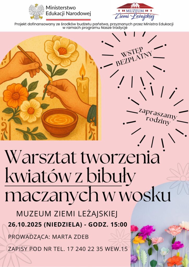 Muzeum Ziemi Leżajskiej zaprasza całe rodziny na wyjątkowe warsztaty rękodzielnicze, podczas których uczestnicy poznają dawną technikę wykonywania kwiatów z bibuły maczanych w wosku – niegdyś popularną metodę tworzenia kompozycji nagrobnych. To piękne, symboliczne rękodzieło idealnie wpisuje się w jesienny czas zadumy, refleksji i pamięci o bliskich.